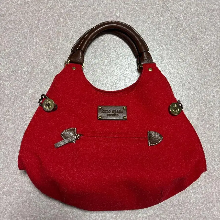 울? 펠트와 같은 소재의 레드 토트백, 브라운 가죽 핸들 부착.