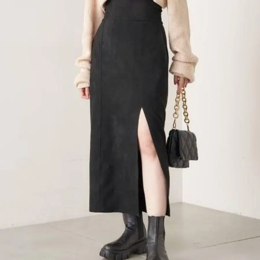 anuans 분또 스웨이드 타이트 스커트 라이트 그레이 롱 슬릿 밴딩