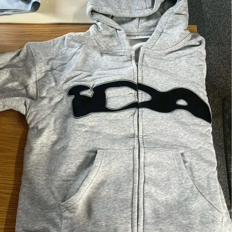 프론트에 블랙 로고가 들어간 그레이 색상의 집업 후드티.