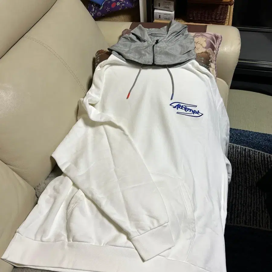 화이트와 그레이 색상의 풀 집업 후드티, Attempt 로고 자수 포함. - 브랜드: Attempt - 색상: 화이트/그레이 - 특징: 풀 집업 후드 - 자수 디자인: Attempt 로고 방문해 주셔서 감사합니다. 사이즈 - XL(LL)