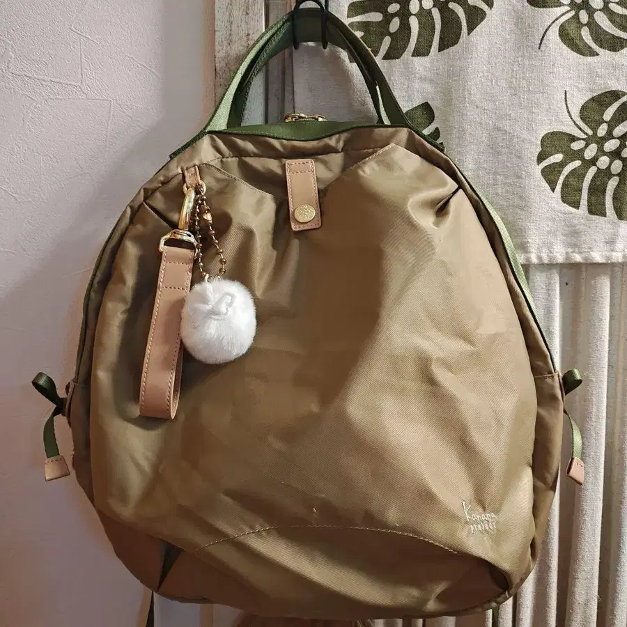 카키색 백팩으로, 퍼가 달린 키링과 골드 컬러 장식 버튼이 특징입니다.