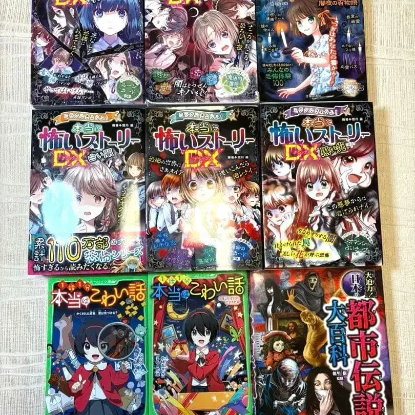 호러 코믹스 [ 무서운 스토리 DX ] 시리즈 5권 도시전설대백과 정말로 있었던 무서운 이야기 1화 1분 정말로 무서운 이야기 총 9권입니다. 대체로 새상품급이지만, 정말로 무서운 스토리의 파란 눈물과 빨간 밤 2권은 아끼던 책이라 특히 읽은 느낌이 있습니다.