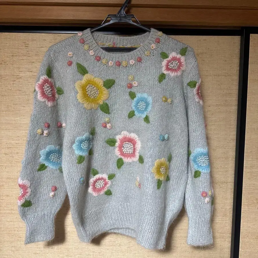 꽃무늬 자수가 들어간 긴팔 니트 스웨터입니다.