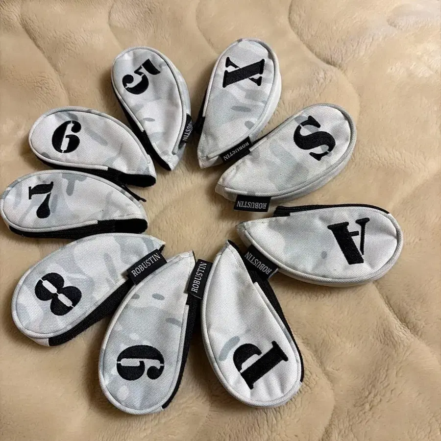 ROBUSTIN제 아이언용 헤드커버 세트, 화이트/블랙 디자인으로, 번호 포함.