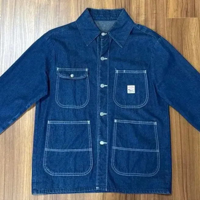 진한 블루 데님 소재의 커버올, 4개의 포켓이 있어 실용성이 높습니다.