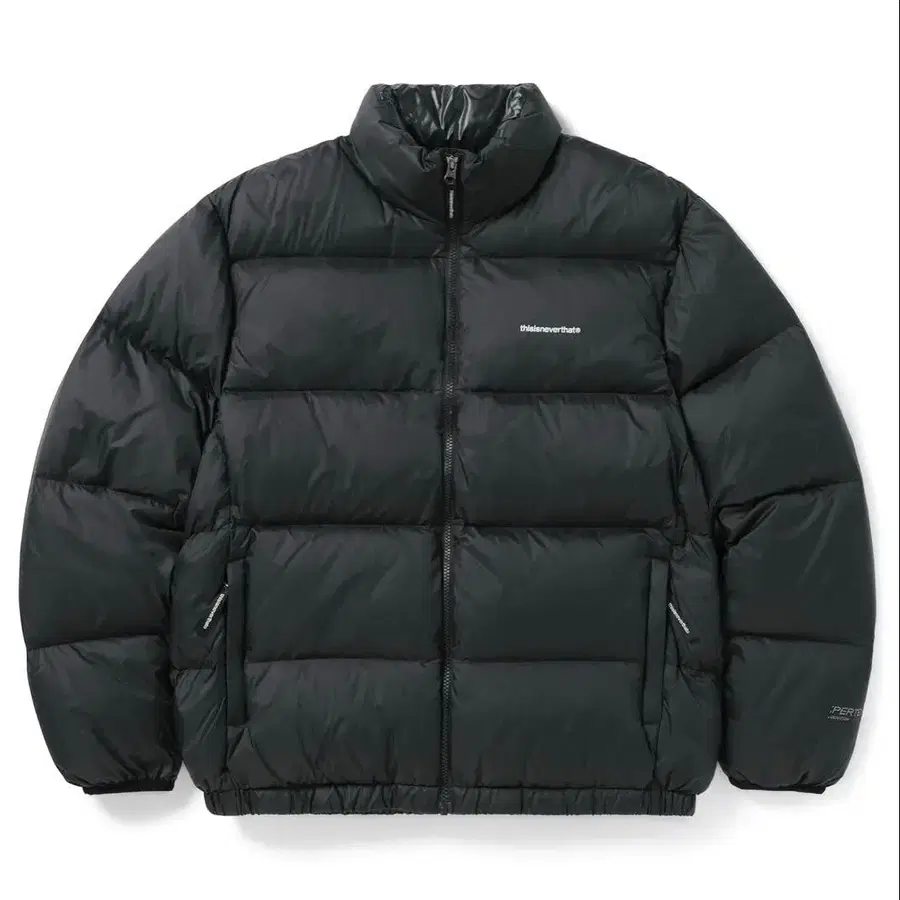 방수성 폴리에스테르 소재를 사용한 블랙 다운 자켓.
