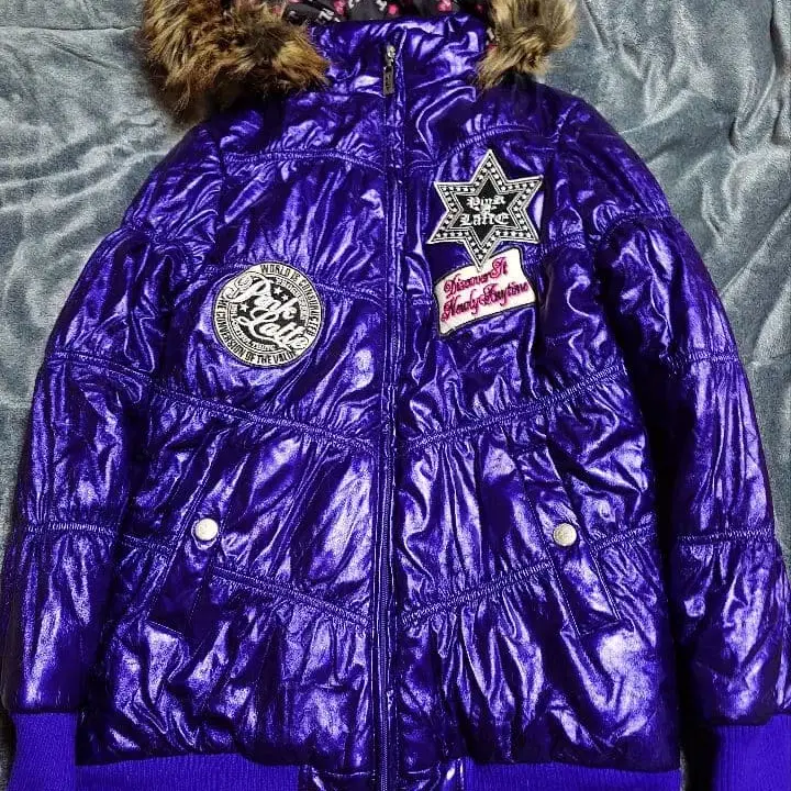 광택감 있는 퍼플 다운 자켓, M 사이즈, 퍼 후드와 자수 패치가 특징. - 색상: 퍼플 - 사이즈: M - 디자인: 퍼 후드 - 특징: 광택감 있는 소재 - 장식: 자수 패치 포함 방문해 주셔서 감사합니다. 얼룩, 찢김, 냄새 등 - 없음 #y2k #헤이세이 갸루
