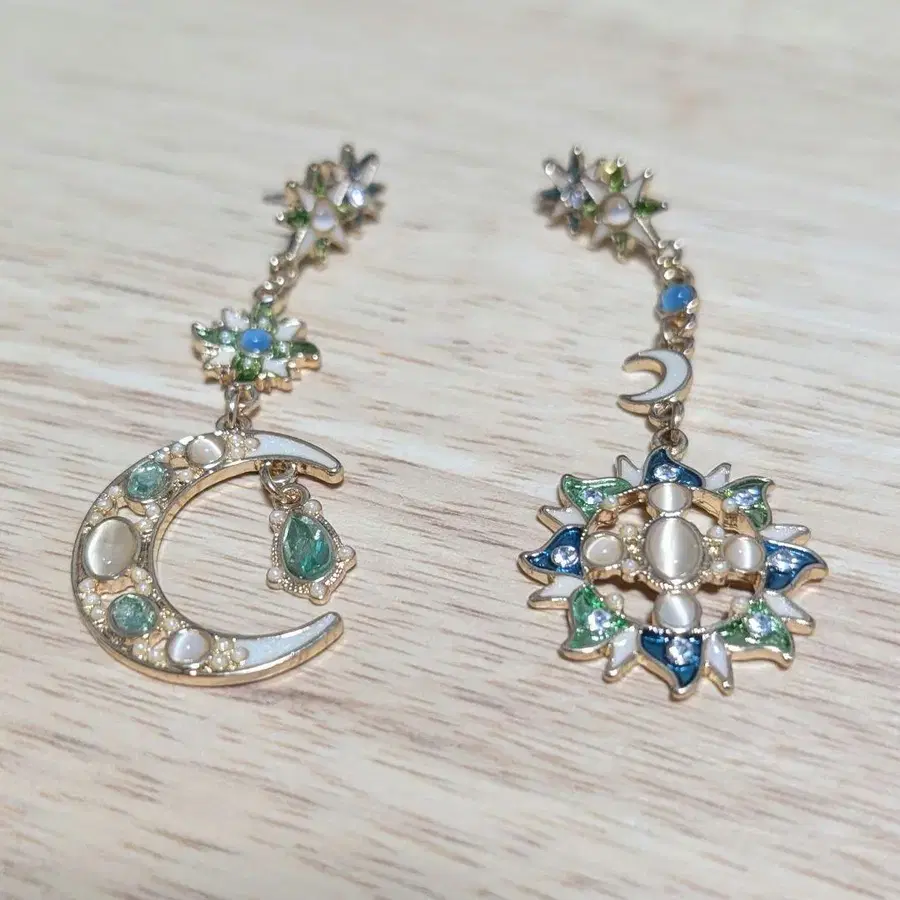 태양 & 문 태양과 달을 모티브로 한 귀걸이입니다. 색상도 귀엽고, 스톤이 달린 제품입니다. - 디자인: 달과 태양 모티브 - 색상: 골드, 파랑, 그린 - 장식: 스톤 포함 - 스타일: 캐주얼, 엘레강트 방문해 주셔서 감사합니다.