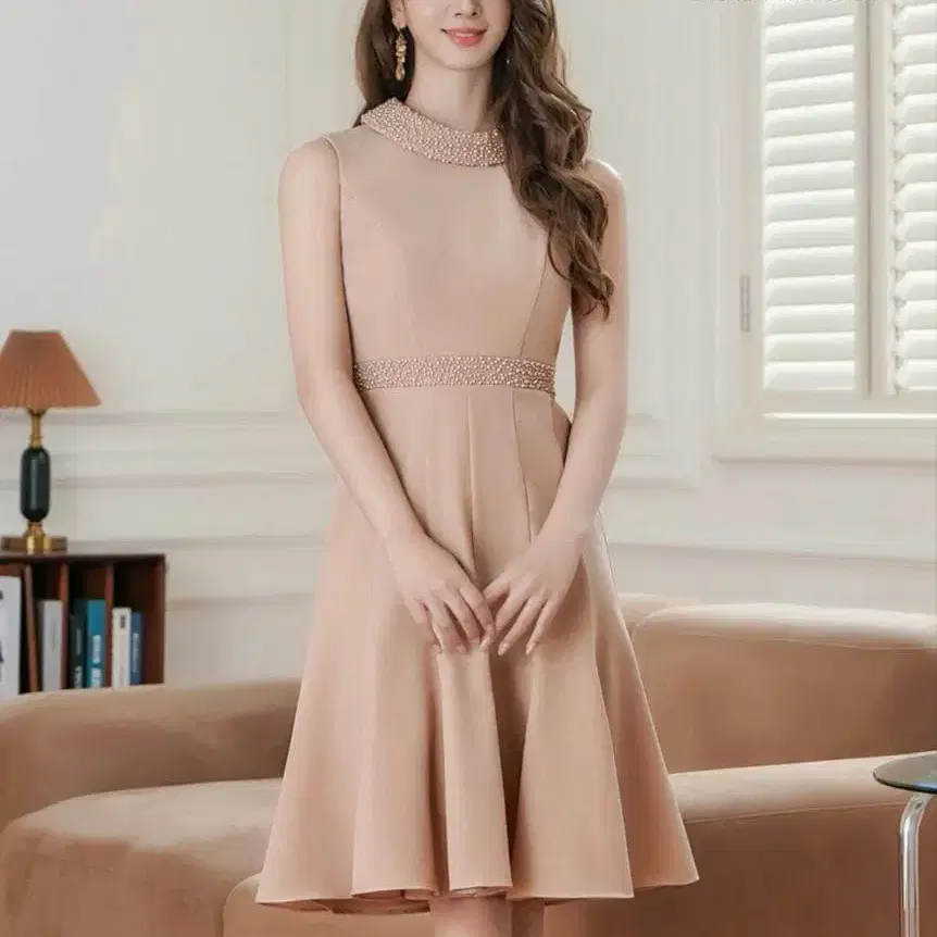 목 부분에 펄 장식이 있는 미디엄 드레스 원피스.