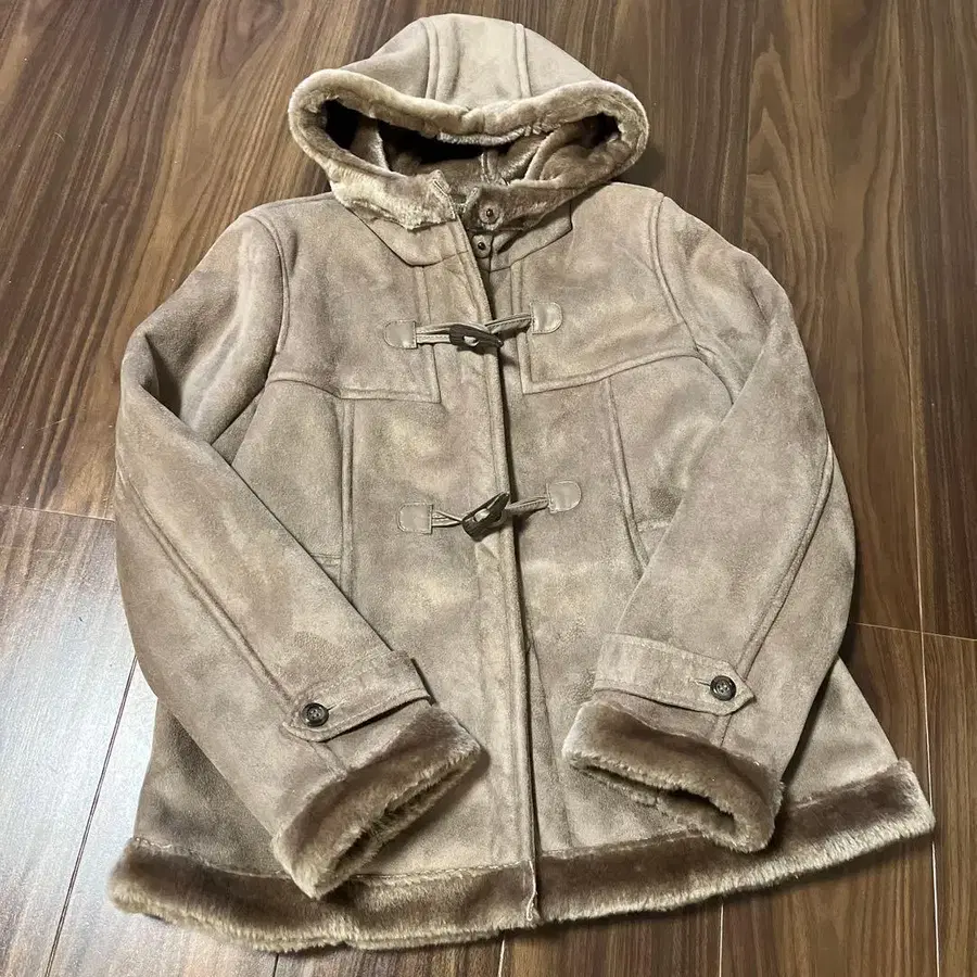 후드 부착 브라운 무스탕 코트, 안쪽 플리스 소재로 따뜻합니다. - 색상: 브라운 - 디자인: 후드 부착, 더플 코트 스타일 - 안쪽 소재: 플리스 소재 - 사이즈: M - Chris Montez 방문해 주셔서 감사합니다.