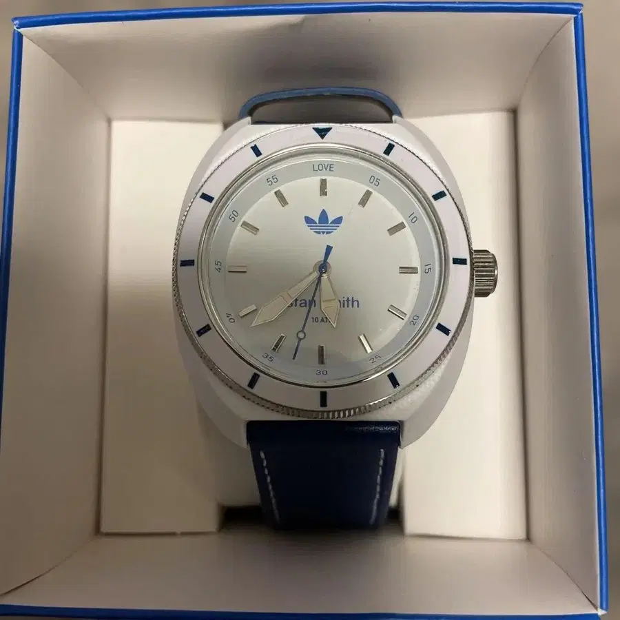 adidas 스탠스미스 화이트와 블루 색상의 쿼츠 손목시계. - 브랜드: adidas - 색상: 화이트/블루 - 모델명: 스탠스미스 - 타입: 쿼츠 - 소재: 가죽/스테인리스 스틸 - 미사용 새상품이지만 배터리가 방전되었습니다. - adidas 신사이바시점에서 구매 방문해 주셔서 감사합니다.