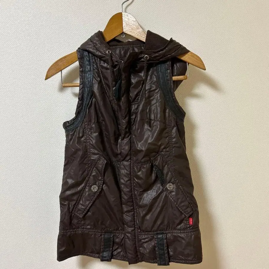 후드 부착 브라운 다운 베스트, 나일론 소재로 경량. - 색상: 브라운 - 디자인: 후드 부착 - 포켓: 앞면에 2개의 포켓 - 소재: 나일론 계열 소재 - 스타일: 베스트 방문해 주셔서 감사합니다. 사이즈 - S