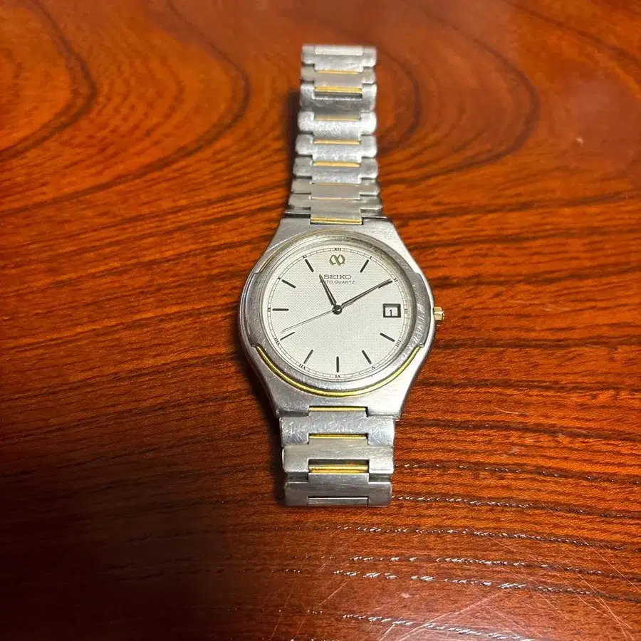 실버와 골드의 콤비네이션이 특징인 아날로그 손목시계, 날짜 표시 기능 포함.