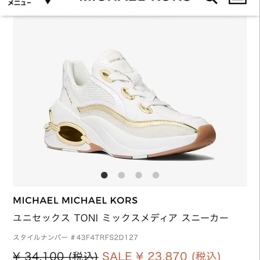 옵티컬 화이트와 페일 골드의 콤비네이션이 매력적인 스니커즈. - 브랜드: MICHAEL MICHAEL KORS - 모델명: TONI 믹스 미디어 스니커즈 - 색상: 옵티컬 화이트/페일 골드 사이즈 - 24cm