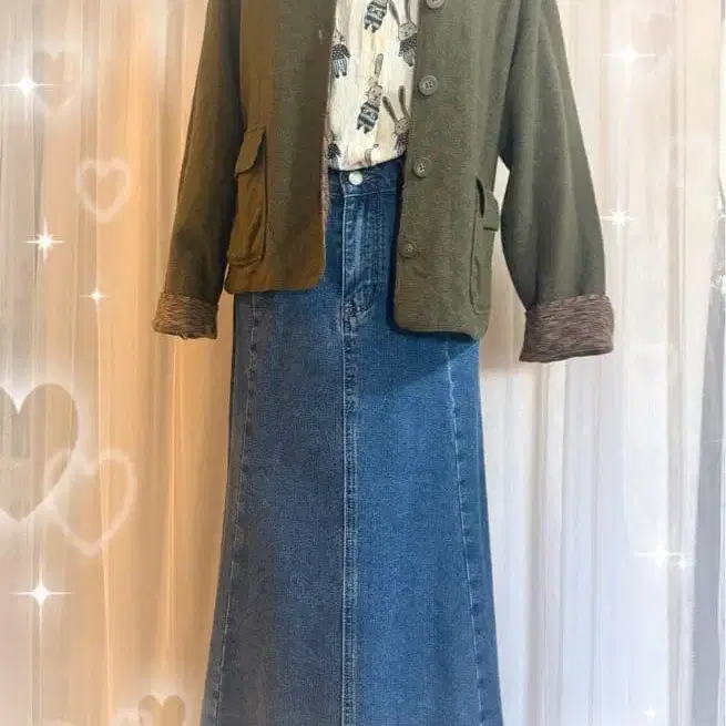 올리브 그린 자켓과 데님 스커트