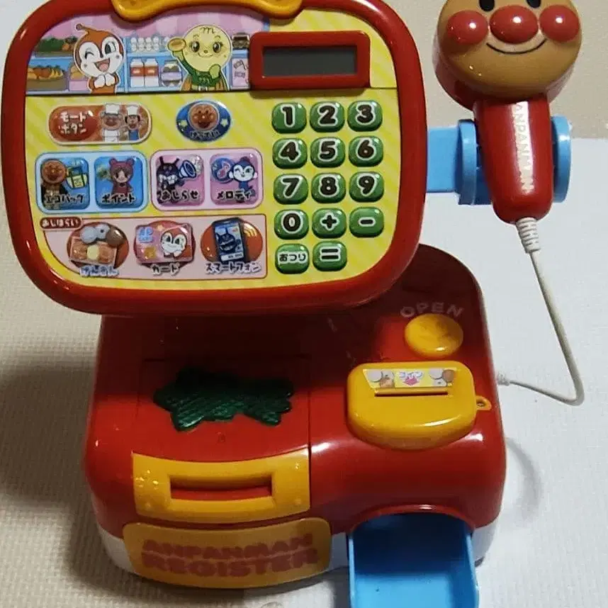 호빵맨의 즐거운 계산대, 돈 세트 포함으로 놀면서 배울 수 있는 완구. 계산 모드는 계산기와 같아서 덧셈, 뺄셈이 가능하므로 비교적 오래 가지고 놀 수 있었습니다. 지폐, 코인 모두 전부 갖춰져 있지만, 일부 잡화가 부족합니다. 본체는 깨끗한 상태이지만, 지폐는 일부 접힌 부분이 있으며, 접혀 있으면 계산대의 흡입이 불가능합니다. 설명서는 있지만, 외부 박스는 없습니다. - 상품명: 호빵맨 계산대 - 색상: 빨간색 - 부속품: 돈 세트 - 제조사: SEGA - 대상 연령: 1.5세 이상 - 돈 종류: 천 엔권, 만 엔권 방문해 주셔서 감사합니다.