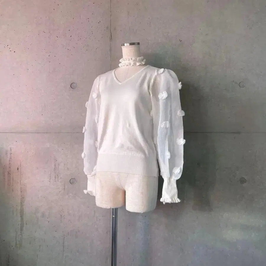 택 포함 새상품 초커 포함 폼폼 시스루 시어 슬리브 V넥 니트 화이트