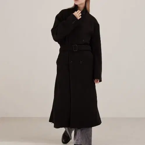 테크 멜톤 소재의 블랙 더블 체스터 코트, 사이드 지퍼 디자인으로 스타일리시합니다.