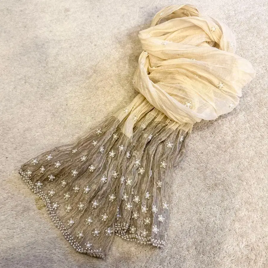 결혼식용으로 어떠신가요? 길이 약 190cm 폭 약 55cm 평평하게 놓았을 때 치수 측정 가벼운 쉬폰 소재에 섬세한 펄 장식이 더해진 스톨! 정말 정말 귀여워요! 나이가 들어 결혼식에 입고 갈 일이 없어졌기에 판매합니다. 펄이 떨어진 곳도 없습니다. 튼튼하게 붙어 있어 잘 떨어지지 않습니다. - 색상: 베이지 - 장식: 펄 장식 - 소재: 쉬폰풍의 가벼운 원단 - 디자인: 꽃 무늬 자수