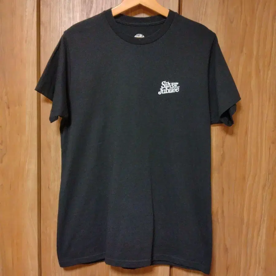 프론트에 [ Silver Jubilee ] 로고, 백에 왕관 디자인이 특징인 블랙 티셔츠.