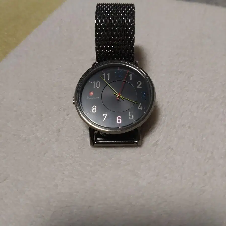 [ 리벤햄 수동 와인딩 시계 ] 다크 그레이 다이얼에 컬러풀한 인덱스를 가진 메쉬 밴딩의 수동 와인딩 시계입니다. - 브랜드: Lib.bonham - 색상: 블랙 - 밴딩 소재: 메쉬 - 다이얼 색상: 다크 그레이 - 인덱스 색상: 컬러풀 (빨간색, 파랑, 그린) 방문해 주셔서 감사합니다.