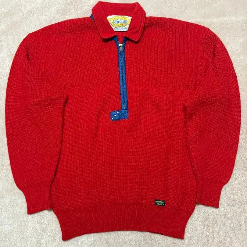리브 니트의 빨간색 집업 스웨터, 가슴 포켓 부착.