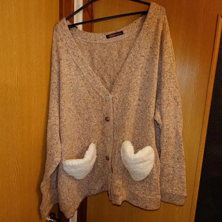 8L 핑크 베이지 니트 가디건 하트 플리스 포켓 부착