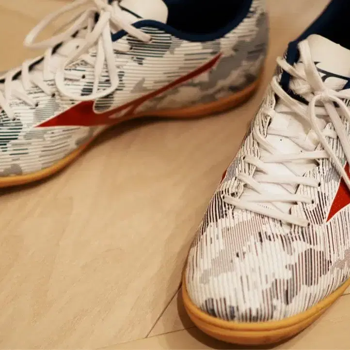화이트와 카모플라쥬 스트라이프 디자인, 고무 밑창 축구화. - 브랜드: Mizuno - 색상: 화이트/카모플라쥬 - 밑창 타입: 고무 밑창 - 디자인: 스트라이프 패턴 27.0cm 방문해 주셔서 감사합니다.