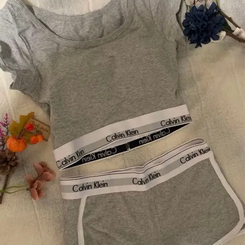 자동 번역되었어요. 원문보기그레이 색상의 코튼 혼방 소재로, Calvin Klein 로고가 새겨진 허리 밴딩이 특징인 셋업입니다. 상의는 패드가 포함된 타입입니다.