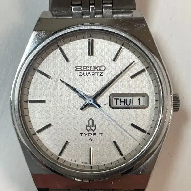 실버 다이얼에 날짜 표시 기능을 갖춘 SEIKO 쿼츠 손목시계. - 브랜드: SEIKO - 모델: TYPE II - 기능: 쿼츠 - 색상: 실버 - 날짜 표시: THU 1 7546-7000 배터리는 새것으로 교체했습니다. 유리 표면에 흠집이 있습니다. 용두 조작은 문제 없습니다. 케이스 가로 사이즈는 용두를 제외하고 35mm입니다. 타사 제품 밴딩 길이는 약 20cm입니다. 부속품은 없습니다. 잘 부탁드립니다. 방문해 주셔서 감사합니다.