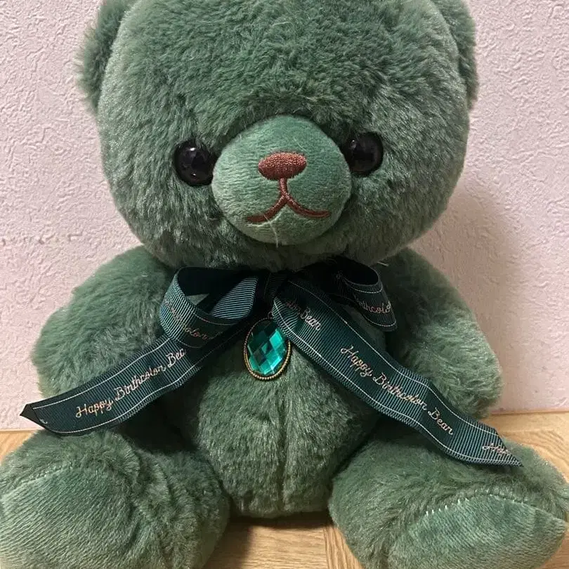그린 컬러 곰 봉제 인형. 리본에는 HappyBirthday 문자가 새겨져 있습니다.