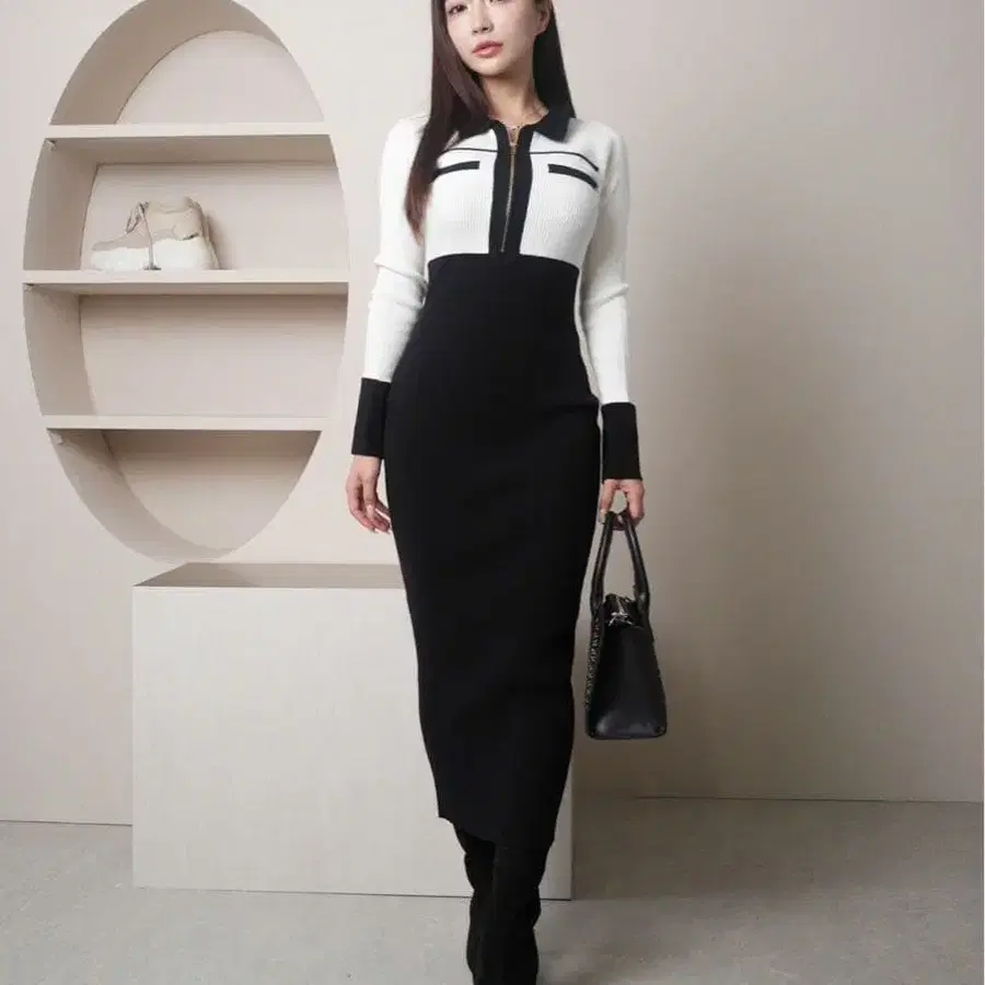 프론트 ZIP 바이 컬러 니트 원피스