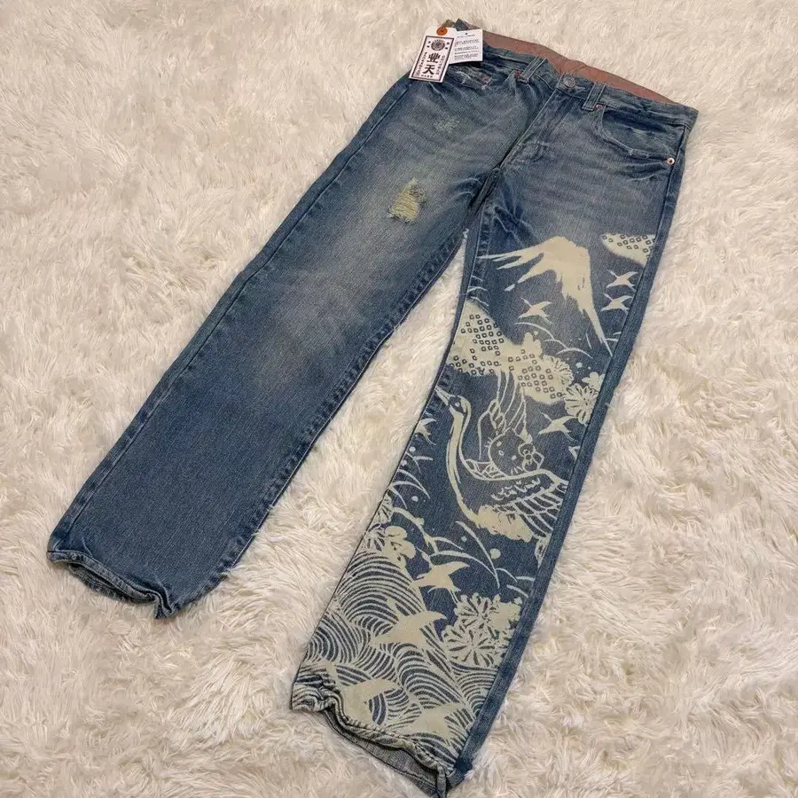 키티와 호텐 상점의 콜라보 청바지입니다(^^) ⚫︎ 브랜드 호텐 상점 ⚫︎ 색상 블루 계열 ⚫︎ 사이즈 총길이: 94 허리: 38 x 2 밑위: 25 인심: 69 힙: 84 허벅지 폭: 26 밑단 폭: 20 ※ 평평하게 놓았을 때 치수입니다. ※ 약간의 오차가 있을 수 있습니다. 양해 부탁드립니다. ● 상태 택 포함 새상품입니다. 힙에 부착된 호텐 상점의 천 택은 버튼에 걸려 있는 것이므로 제거 가능합니다.