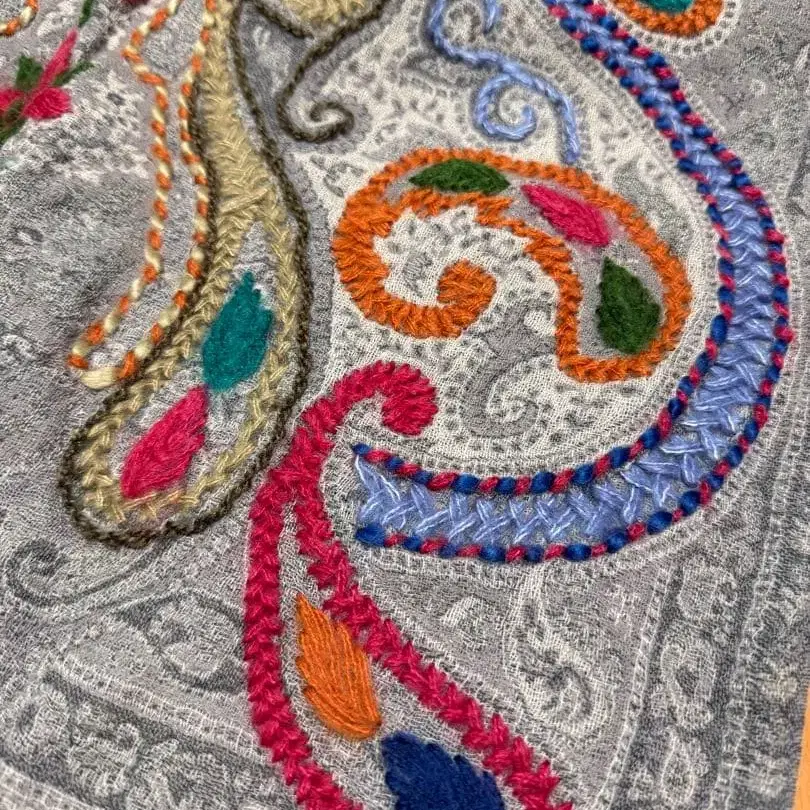 자동 번역되었어요. 원문보기인도 자수가 놓인 그레이 색상의 스톨로, 다색 자수가 특징입니다.