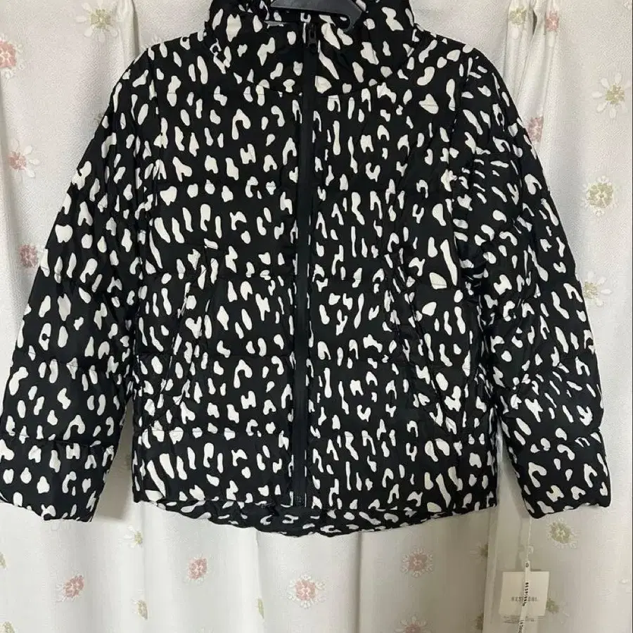 자동 번역되었어요. 원문보기검정색과 흰색의 반점 무늬 풀 집업 다운 자켓.