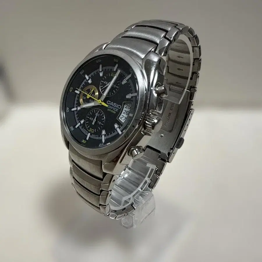 스테인리스 스틸 소재의 CASIO 크로노그래프 손목시계, 블랙 다이얼과 날짜 표시 기능 포함. - 브랜드: CASIO - 색상: 블랙 - 소재: 스테인리스 스틸 - 기능: 크로노그래프 - 날짜 표시: 있음 방문해 주셔서 감사합니다.