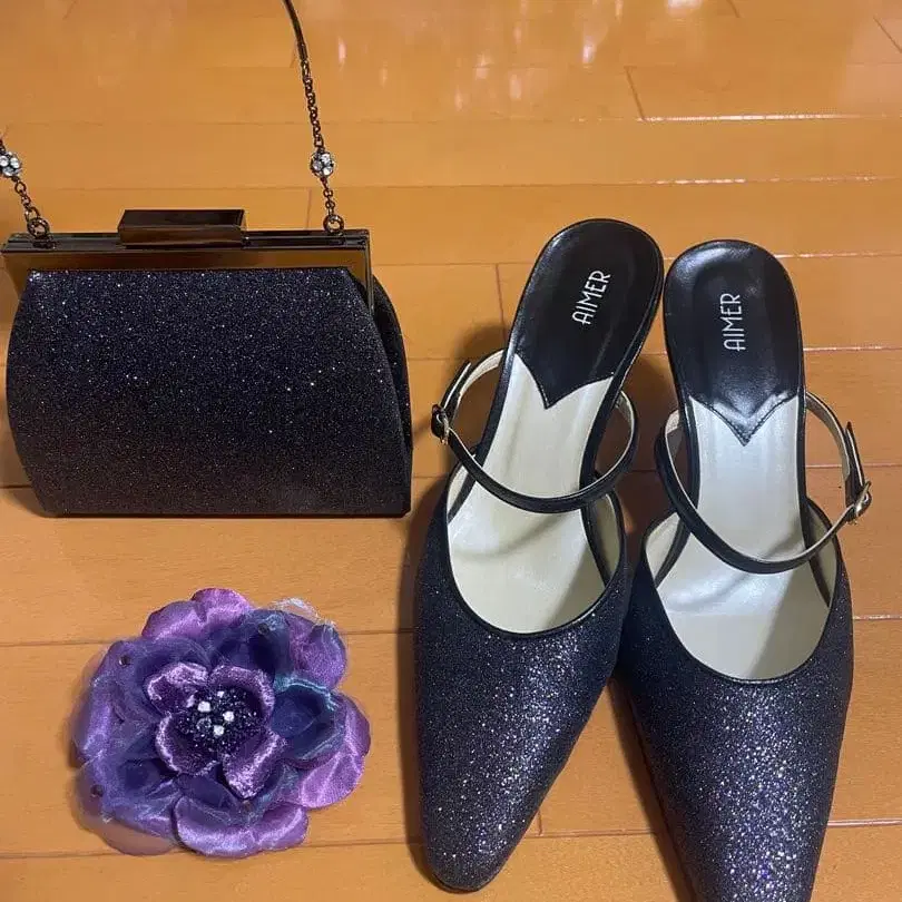 다크 퍼플 글리터가 아름다운 스틸레토 힐과 핸드백 세트. 결혼식에서 몇 번 사용했습니다. 신발은 실내에서만 사용. 백에 일부 얼룩 같은 흔적 있음 (사진 5장). - 브랜드: AIMER - 색상: 다크 퍼플 - 스타일: 스틸레토 힐 - 굽 높이: 약 8cm - 부속품: 핸드백, 플라워 모티브 방문해 주셔서 감사합니다. 신발 사이즈 - M