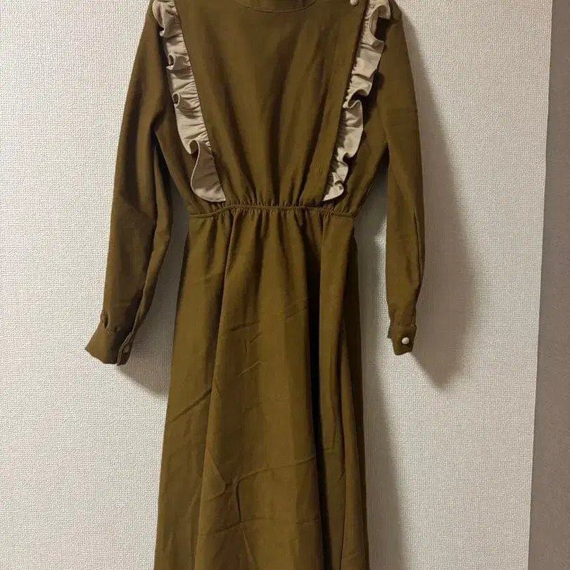카멜 색상의 프릴 긴팔 원피스, 허리밴딩으로 편안한 착용감. - 색상: 카멜 - 디자인: 프릴, 허리밴딩 - 소매 길이: 긴팔 - 스타일: 캐주얼 방문해 주셔서 감사합니다. 이전에 구제 의류 매장에서 구매한 제품입니다. 가을/겨울 소재의 약간 레트로한 분위기의 원피스입니다.