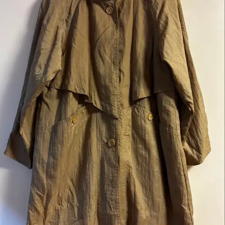 베이지색 롱 기장 트렌치코트, 스탠드 카라와 버튼이 달린 디자인이 특징입니다. 라이너 포함 - 색상: 베이지 - 디자인: 프론트 오픈, 단추식 - 백 디자인: 버튼이 달린 뒷모습 디자인 - 스타일: 롱 기장, 오버 사이즈 - 옷깃: 스탠드 카라 방문해 주셔서 감사합니다. 사이즈 - M~L