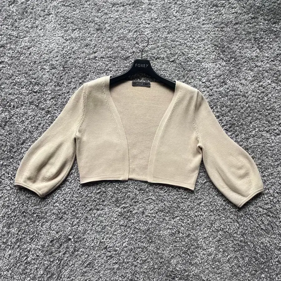 베이지 계열. 퍼프 슬리브 디자인. 앞 여밈은 없습니다.