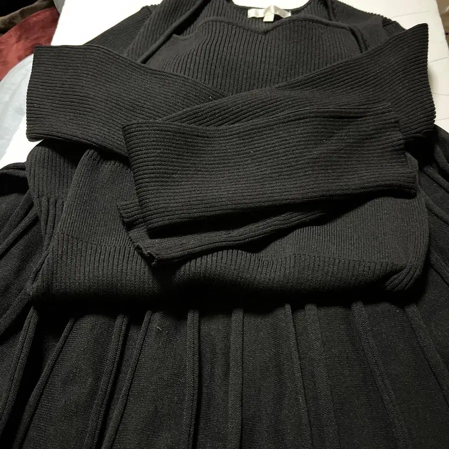 블랙 니트 롱 원피스, 플리츠 디자인으로 스타일리시합니다. - 색상: 블랙 - 소재: 니트 - 디자인: 플리츠 스커트 스타일 - 사이즈: 프리 어깨 너비 약 34cm, 가슴 폭 약 38cm 기장 약 124cm, 밑단 폭 약 100cm 방문해 주셔서 감사합니다.