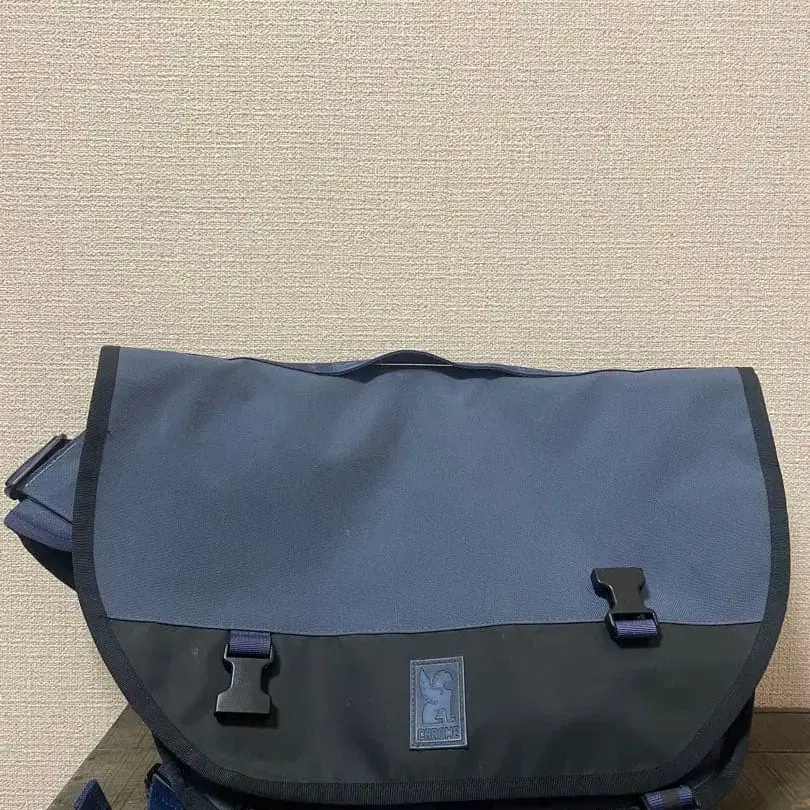 네이비 색상의 메신저 백, 플랩과 버클 포함.