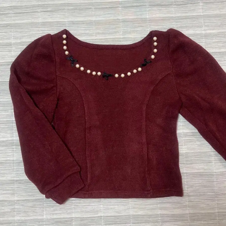 펄 장식과 퍼프 슬리브가 특징인 버건디 니트.