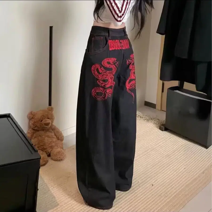 빨간색 자수 뱀이 특징인 와이드 레그 데님 팬츠.