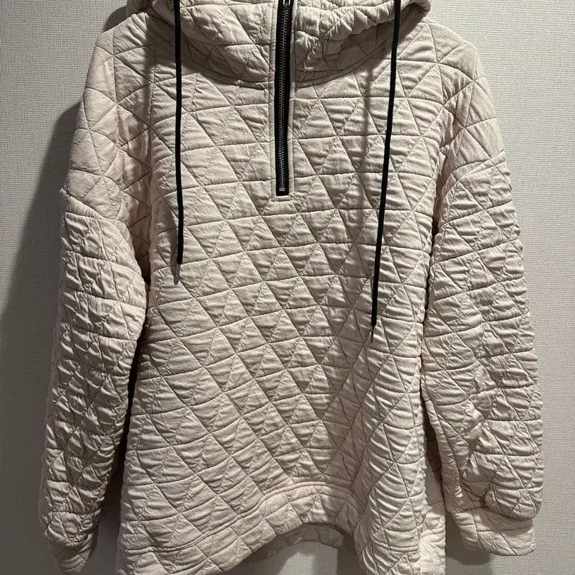 크림색 퀼팅 후드 부착 후드티, 하프 지퍼 디자인에 오버 사이즈. - 색상: 크림색 - 디자인: 퀼팅 - 후드: 후드 부착 - 지퍼: 하프 지퍼 - 스타일: 오버 사이즈 방문해 주셔서 감사합니다. 사이즈 - L 색상 - 베이지 계열 얼룩, 찢김, 냄새 등 - 없음 한 번 착용했지만 얼룩은 없습니다. 원단은 부드럽고 착용감이 좋습니다.