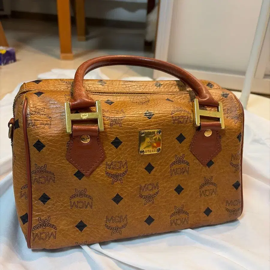 MCM 로고 프린트가 들어간 브라운 가죽 보스턴 백.