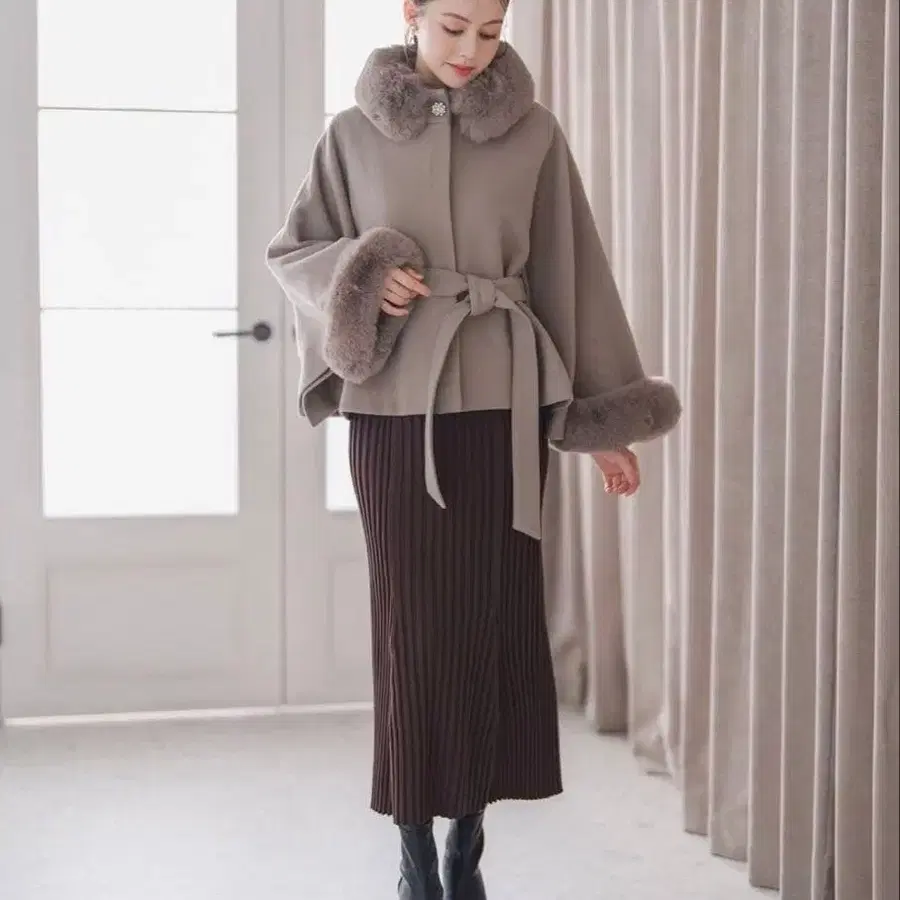 • Andy 퍼 달린 블랙 판초 케이프 코트 기장 80