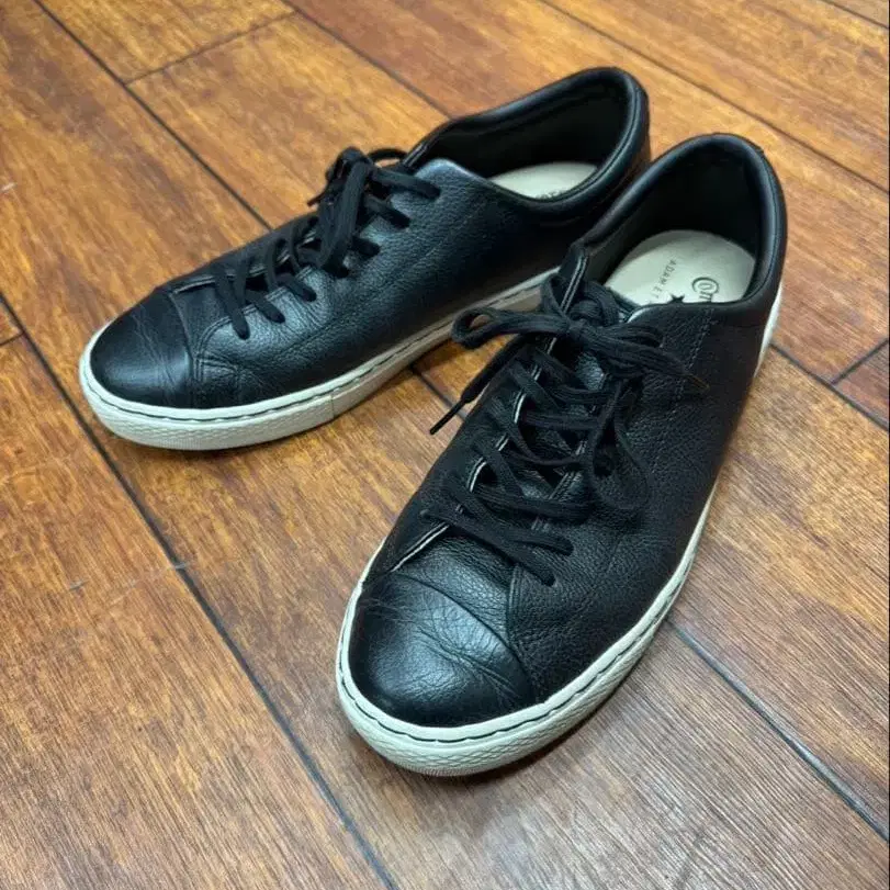 가죽 소재의 블랙 스니커즈, 스타일리시한 디자인.