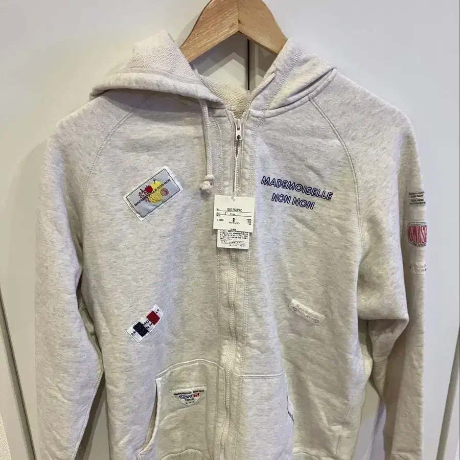먼저 프로필을 확인해 주세요. 후드 부착 라이트 그레이 색상의 후드 맨투맨, 자수와 패치가 특징입니다. - 디자인: 후드 부착, 지퍼 타입 - 소재: 맨투맨 원단 - 색상: 라이트 그레이 - 자수: 'MADMOISELLE NON NON' 자수 - 패치: 국기 디자인 패치 부착 방문해 주셔서 감사합니다. 사이즈 - M
