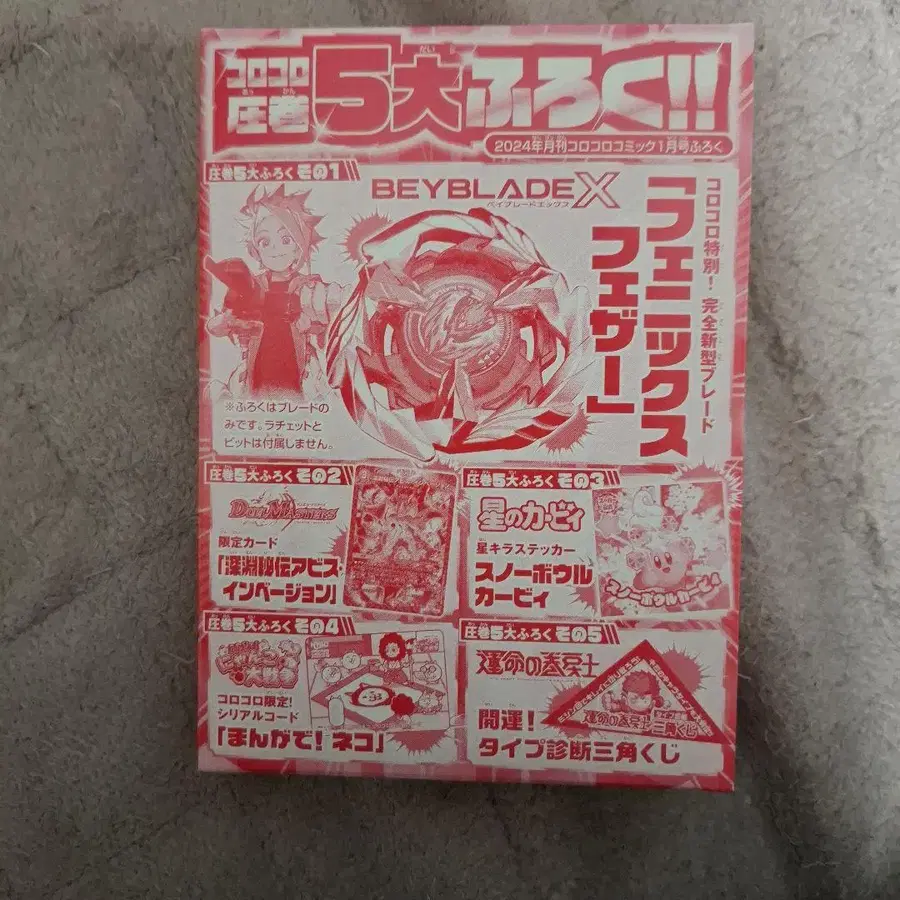 2024년 월간 코로코로 코믹 1월호 부록 코로코로 압도적 5대 부록!! 피닉스 페더 베이블레이드 X 베이 코드 없음. 라쿠라쿠 메루카리 택배로 발송합니다. 즉시 구매 환영. 부탁드립니다.